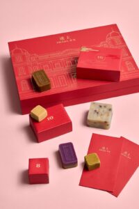 Meanwhile, the Almond Dark Chocolate Carré pairs rich dark chocolate with crunchy roasted almonds, creating a layered bite with lingering depth. Wrapped in gold packaging and adorned with lucky coin motifs, it symbolises prosperity and good fortune.