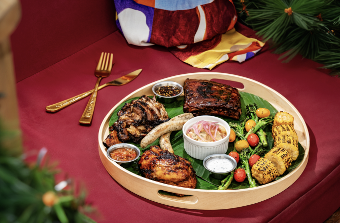 At the core of the platter lies the Makassar “Konro” Beef Short Ribs, featuring 120 days of Australian grain-fed beef short ribs marinated in a house-concocted ‘konro’ paste, crafted from the esteemed buah keluak. Slow-cooked for 13 hours, it achieves a tender, exquisite texture. Additionally, the platter offers Grilled 14 Hours of Slow-Cooked Canadian Pork Ribs, presenting succulent, tender pork infused with homemade sambal merah, Spicy Balinese “Betutu” Grilled Chicken, and Nurnberger Pork Sausages. The accompanying sides encompass American-style potato Salad, Garlic Butter Broccolini, and a delectable trio of dipping sauces: yoghurt salsa, sambal tomato salsa, and sambal kecap.