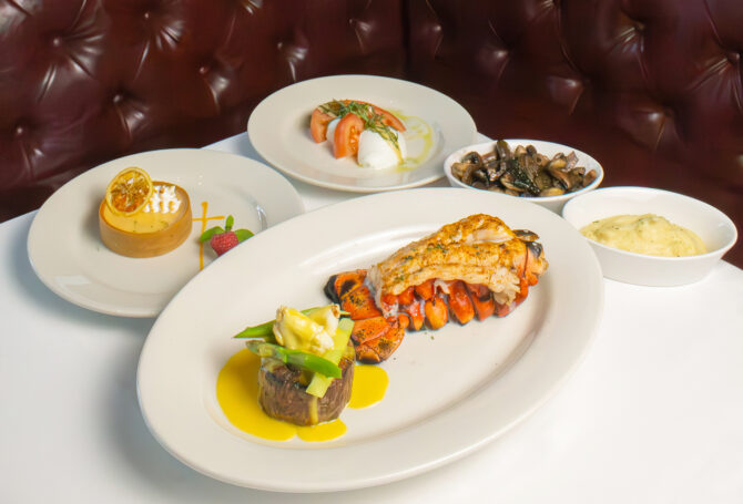 The journey begins with a refreshing appetizer of Fresh Mozzarella and Tomatoes, a light and vibrant way to kick off the celebration. The star of the show is the Entrée Platter, featuring a decadent combination of Broiled Lobster Tail with Garlic Butter and a Petite Filet Oscar – a land and sea medley that perfectly embodies the boundless love of a mother. Classic sides like Mashed Potatoes and Sautéed Mushrooms round out the main course.