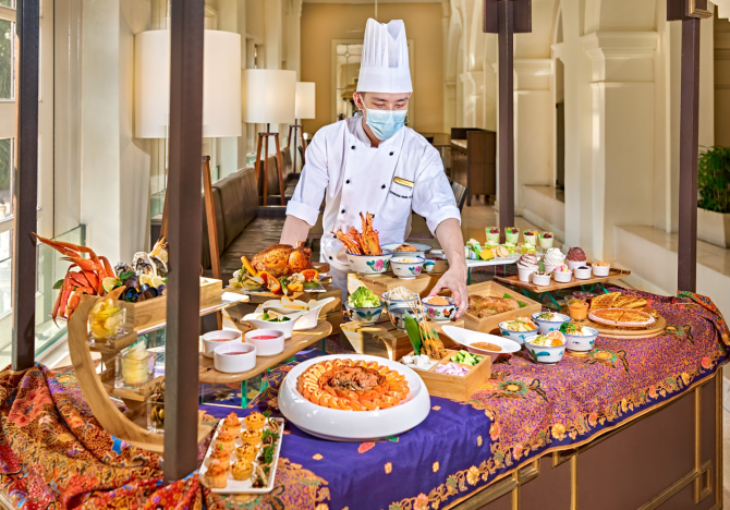 Be spoilt for choice with the generous spread of international and local favourites spanning sandwiches and croissants to cheeses and hot savouries like Swedish Meatballs in Creamy Buah Keluak Sauce; Cheesy Chaat Masala Potato Wedges with Mango Chutney Aioli; Crispy Prawn Fritters with Mala Dipping Sauce, followed by a carving of Classic Beef Wellington with Morel Cream Sauce. Other National Day specials include well-loved local favourites such as Laksa; Dry Mee Siam with Prawns and Egg; Kueh Pie Tee; Black Fungus Crystal Dumplings; Chicken and Pork Satay with Condiments and Lemongrass Peanut Sauce; and Stir-fried Carrot Cake with Sweet Sauce. A sweet finish is guaranteed with the tempting array of desserts, including Ondeh Ondeh Cake; Milo Dinosaur Financier; Indian Carrot Cake with Cheese; and Gulab Jamun with Nuts, among other toothsome options.