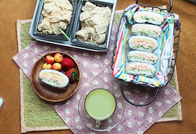 “Onigiri” means Japanese rice ball. Onigirazu is in the shape of a flat rectangle, like a rice sandwich wrapped in seaweed.