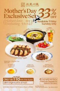 Celebrate Mother’s Day with 33% off CHEFLAM’S SICHUAN CUISINE’s special set menu—just S$118++ for 4 persons! This offer is available for one day only, 11 May 2025!