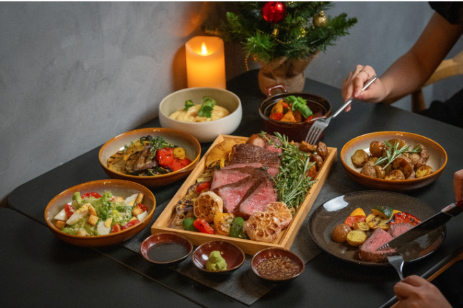 Make this Christmas unforgettable with the Wagyu X festive takeaway, showcasing the exclusive Wagyu X beef. Wagyu X is a distinctive crossbreed from Hokkaido that isn’t typically found beyond Japan. It’s a fusion of the Kuroge black Wagyu cow and Aberdeen Angus bull, resulting in a Wagyu of exceptional quality boasting the marbling akin to A5 Wagyu and the robust flavor profile reminiscent of Angus beef.