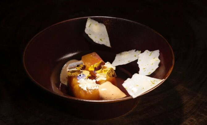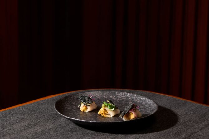 The culinary journey begins with dishes like Loire Valley Oscietra Caviar, featuring scallop tartare and a green tea mousse topped with Oscietra caviar and basil oil. Both the lunch and dinner menus share some signature creations. These include Manjimup Marron, gently poached and smoked with Long Jing leaves, served with salsify barigoule and a marron-shell emulsion; Brittany Blue Lobster, confit in lobster butter with braised parsnip and a silver needle tea-infused consommé; and Omi Beef, barbecued over Binchotan with braised leeks, black garlic purée, and a Lapsang Souchong-infused jus. The meal concludes with a Wakayama Mandarin dessert featuring an Araguani chocolate soufflé, Pu’er anglaise, and Wakayama mandarin gelato.