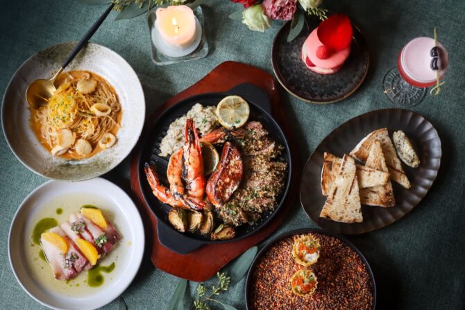 The Valentine’s Day menu at Siri House is designed for sharing and features a curated selection of seafood delights. Diners can savor the Lobster Prawn Kueh Pie Tee topped with ikura, followed by the Habanero Hamachi Tiradito with orange and chili ponzu. The culinary journey continues with Capellini pasta accompanied by lobster Beurre Blanc, Hokkaido scallops, and calamari. A highlight of the meal is the Surf & Turf plate, showcasing herb-crusted prime ribeye, grilled tiger prawns, Ancho chilli reduction, and truffle mash. The romantic dinner concludes with a sweet finale of Lychee Raspberry Mousse and a rose-scented Mega Macaron, perfect for sharing between the two.