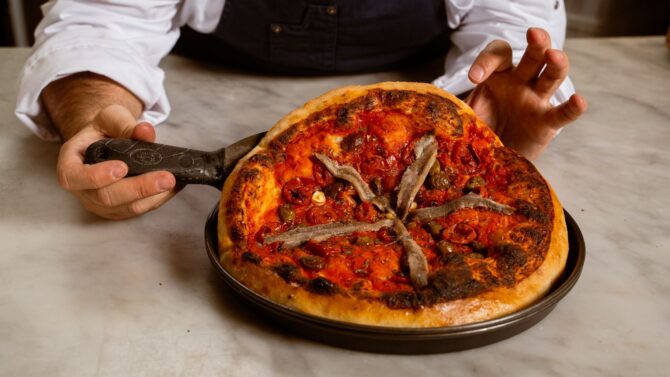 But how do you know if your pizza is Capuano-quality? Simple—he gives you a golden pair of scissors to test them. The signature move at his restaurants is to snip through the pizza yourself. If the crust resists gently while maintaining that light, pillowy bite, you’re in the presence of pizza royalty.