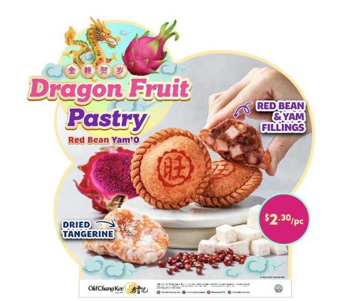The freshly introduced Red Bean Yam’O (S$2.30/pc) from Old Chang Kee arrives in an auspicious flower-shaped pastry donning a vibrant red hue, created using 100% red dragon fruit powder to complement the Chinese Zodiac’s Year of the Dragon. The filling comprises a sweet red bean paste, blended with diced yam cubes and infused with dried tangerine, imparting a hint of citrus to enhance the overall aroma and flavor.