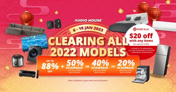 Audio House will clear 2022 models at their Super Huat CNY Sale from now to 18 January 2023. Expect to see Dyson, JBL, KDK, King Koil, LG, Midea, Mitsubishi, Panasonic, Philips, Samsung, Tecno, Toshiba, Whirlpool and more big brand names offering the hottest deals.