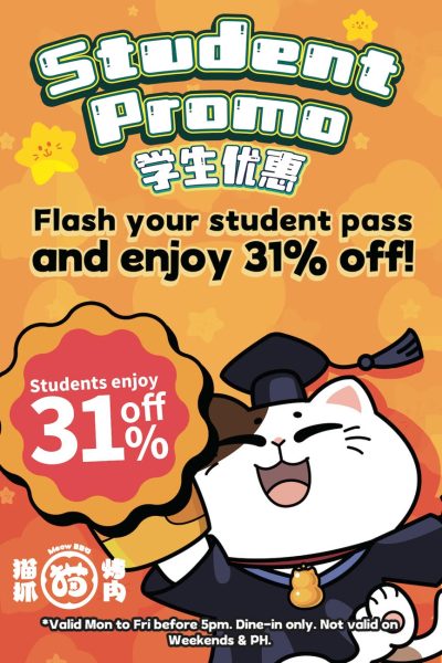 Flash your student pass on Mondays to Fridays before 5 pm and enjoy 31% off your meal at Meow Barbecue! Only one diner needs to be a valid student with the pass for the whole table to enjoy this jaw-dropping discount!
