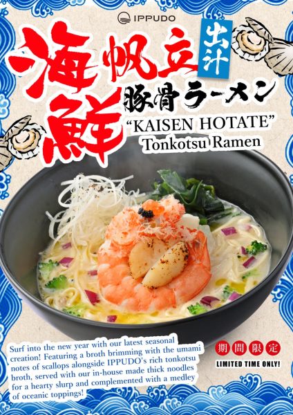 IPPUDO’s Kaisen Hotate Tonkotsu Ramen is priced at $19.90 for dine-in; and $20.90 for takeaway and delivery. Available for a limited time only from now onwards, while stocks last at all IPPUDO Singapore dining outlets, except Marina Bay Sands.