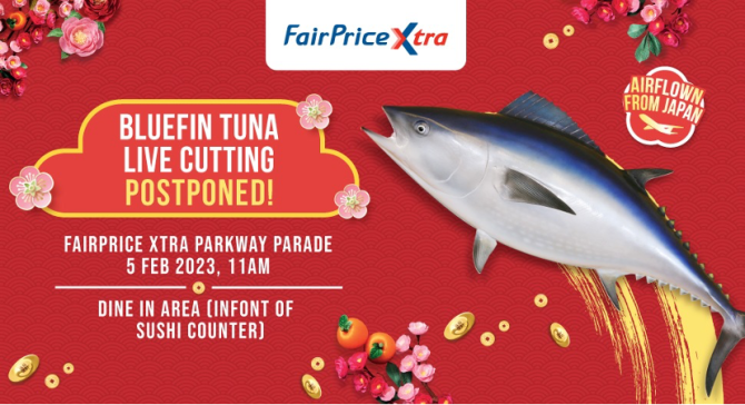 FairPrice Xtra Parkway Parade is bringing the highly prized, massive Southern Bluefin Tuna to shoppers. Savour the delightful experience of eating raw tuna that has been freshly cut before your very eyes! Witness the exhilarating Bluefin Tuna Live Cutting show, held exclusively at FairPrice Xtra Parkway Parade on 5 February 2023, 11am (in front of sushi counter).