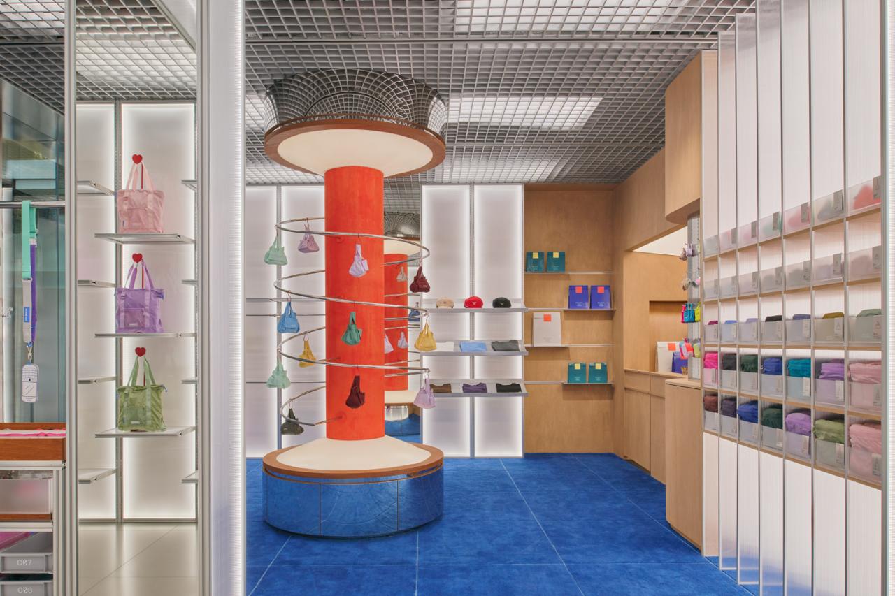 Step out of the mall’s mirrored corridors and into Beyond The Vines (BTV)’s world, where a plush 100% New Zealand wool carpet in unmistakable BTV blue meets clean polycarbonate-and-aluminium arches—and at the centre, a striking custom orange spiral column showcases best-selling bags like rotating gallery pieces. In just 800 square feet, every inch is maximised: pull open walls of drawers to discover accessories arranged with librarian precision, stop by the BTV-TO-GO Phone Strap bar for a hands-free setup that matches your outfit, or browse tees cut exactly the way you wish all basics were cut.