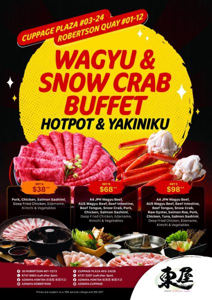 It’s Wagyu madness over at Azmaya, the latest all-you-can-eat yakiniku and shabu-shabu hotspot as it brings a Wagyu lover’s dream to life! For 90 minutes, Azmaya is offering a buffet of all the Gunma and Kagoshima Wagyu and Snow Crab you can eat, grilled as yakiniku, or simmered in shabu-shabu for only S$68++. Enjoy it with free-flow alcohol for an additional S$ 40++ to make it a Wagyu feast worth remembering.