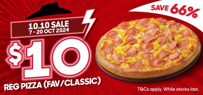 From now until 31 October 2024, enjoy regular pizzas for only S$10 (U.P. S$29.80)! That’s right, you can savour your favourite pizza flavours while saving up to 66% on your usual order!
