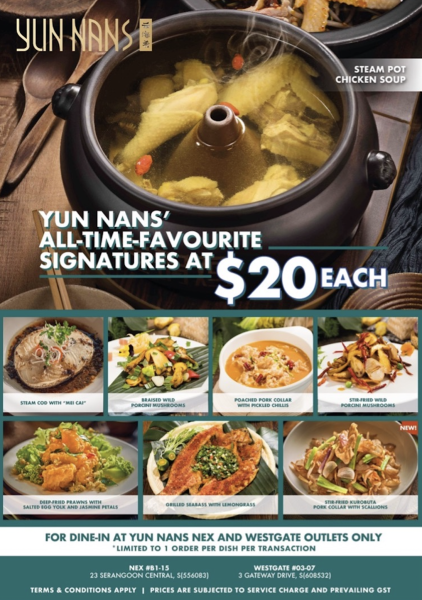 The S$20 promotion is exclusively for dine-in at YUN NANS Westgate and NEX outlets.