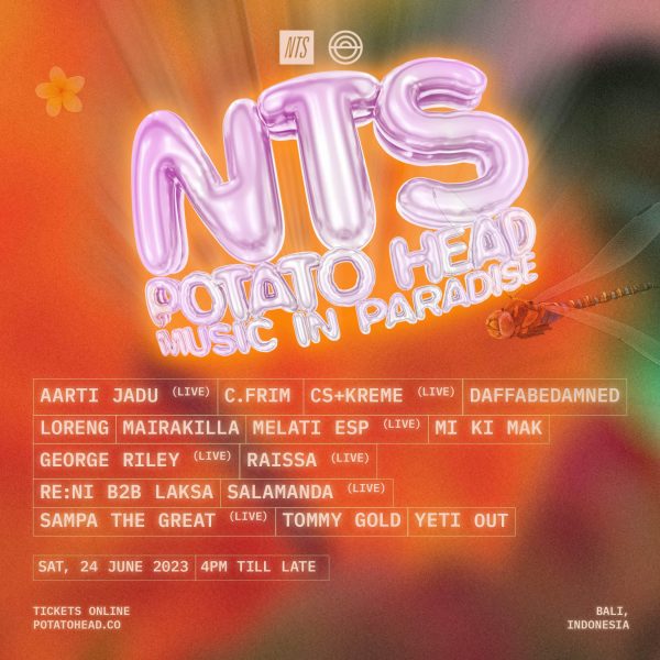 For their Potato Head debut, NTS bring an unmissable selection of artists to grace the stage, with live performances from Sampa The Great, Salamanda, Melati ESP, Raissa Febriani, and Aarti Jadu, and DJ sets from C.Frim, re:ni & Laksa and more. The event occurs across three Potato Head stages, with the party moving between the Beach Club, Sunset Park, and Studio Eksotika.