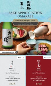 Indulge in a culinary journey with Kou Teppan’s exclusive sake pairing omakase, featuring renowned breweries Hosui Shuzo and Saito Shuzo. This limited-time offer is available on 27 September 2024, at 7:30pm.