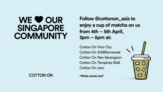 The “Matcha on Cotton On” event runs this weekend, between 3:00 PM and 5:00 PM, at VivoCity, 313@Somerset, Nex Serangoon, Tampines Mall, and Jem. Everyone’s invited—just follow @cottonon_asia on Instagram, swing by any participating store, and grab a complimentary matcha while stocks last.