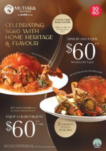 Launched to celebrate Singapore’s 60th birthday and pay tribute to the nation’s fishing village heritage, the promotion is as meaningful as it is mouthwatering. To complete the feast, Mutiara Seafood also offers a special lunch menu for groups of two to ten, perfect for family meals, friendly catch-ups, or team gatherings.